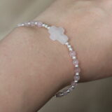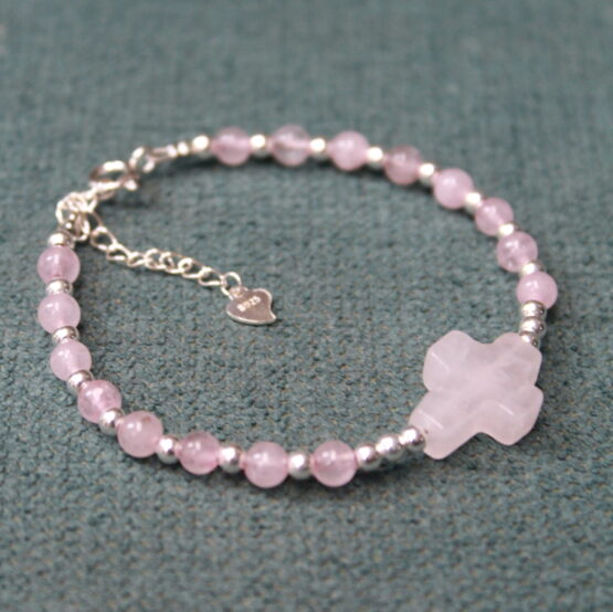 Pulsera con bolitas (4mm) y cruz en cuarzo rosa + bolitas (3mm), cierre y extensor en plata 925.